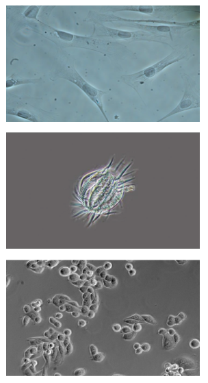 By utilizing changes in the refractive index, high-contrast microscopic images of transparent samples can be obtained using the phase-contrast observation technique. The advantage is that live cell images can be obtained without the use of staining or fluorescent dyes.