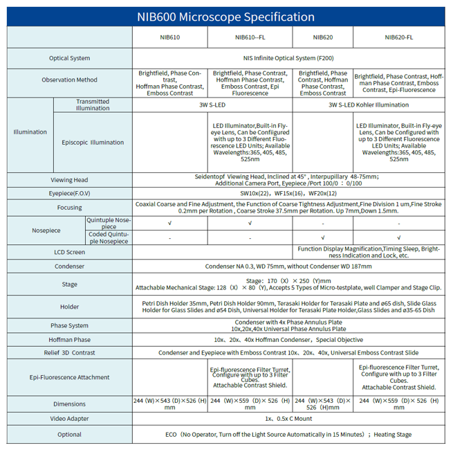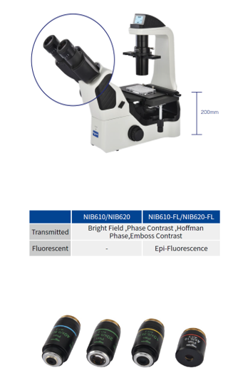 • The Nexcope NIB600 inverted microscope stands out with its sturdy body and base made of corrosion-resistant aluminum alloy. Its white epoxy electrostatic paint coating ensures durability. The microscope features anti-fungal treated optical sets for long-lasting use, and the NIS-60 objective set delivers superior image quality.