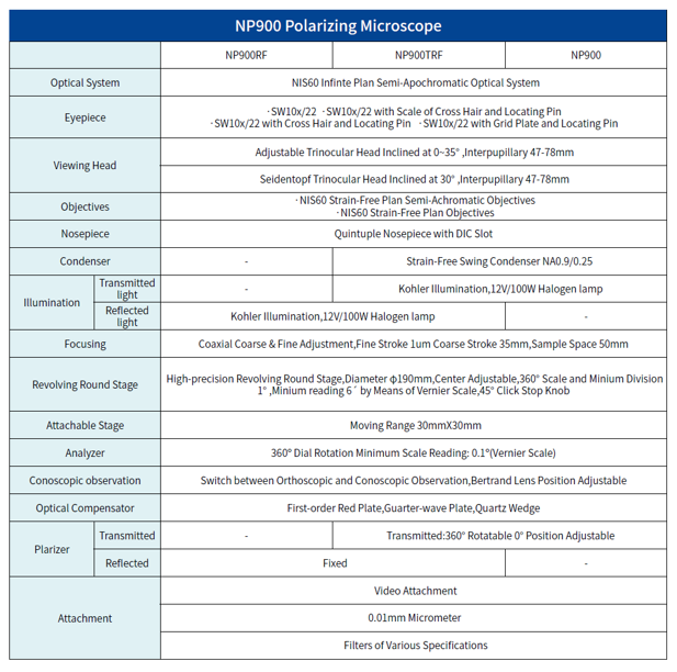 Conventional polarized microscopes are used in geology, mineralogy, metallography and geological investigations. However, as the diversity of fields deepens, polarization microscopes are in demand in more and more fields, including industrial fields such as architecture, materials analysis, semiconductor manufacturing and detection, as well as natural science fields such as forensics, biological research and medicine. At the same time, the application scope and scalability of the microscope should be higher, and specialized microscopes with higher image clarity, better contrast and higher efficiency are needed. The polarizing microscope NP900 is powerful and useful. It can perform many types of observations and provides excellent optical imaging quality.