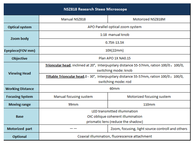 NEXCOPE NSZ818 has an infinity corrected parallel optical system. It allows 3D observations with high resolution and high contrast.