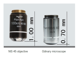 - Using NIS45 infinity corrected optical system, it has excellent optical qualities such as long working distance, strong chromatic aberration correction ability and sharp imaging.