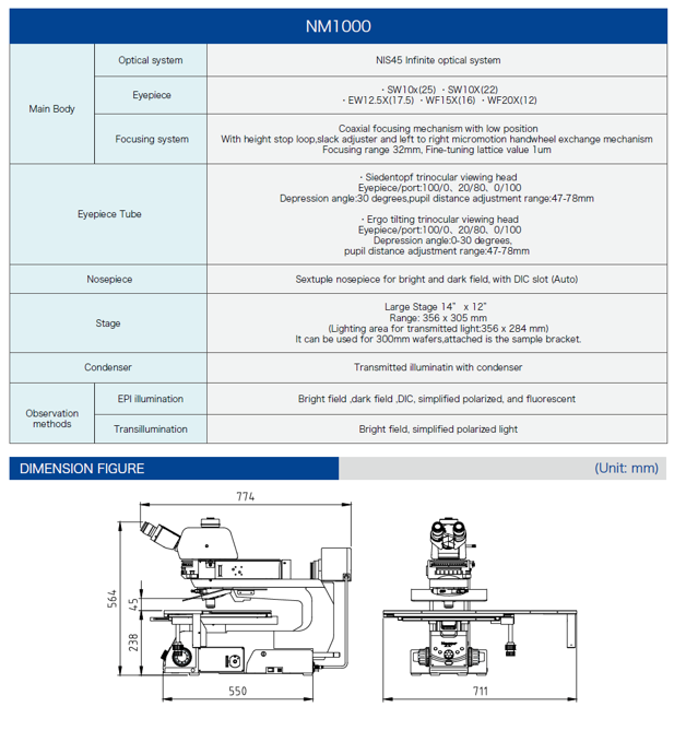 - Specially designed for industrial wide-area observation needs, using a 12-inch super-wide stage to meet FPD and LSI tests simultaneously, adding motorized components such as large platform arms and objective lens replacement; fatigue resulting from long-term microscopic operations.